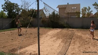 Teens playing badmitten in short jean shorts put their rackets to better use in a more interesting physical activity they can share