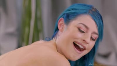 This hot blue hair girl likes to treat her man with a sexy shower and hot massage before she rides his cock