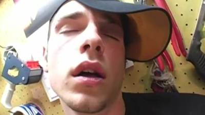 This handy man is in his garage, he takes his dick out of his baggy jeans and starts sensually jerking off.