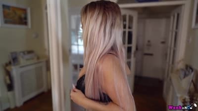 This pretty blonde babe, Dolly P. removes her clothes and caresses her huge boobs. She continues to get naked and she show us her shaved pussy. It is perfect!