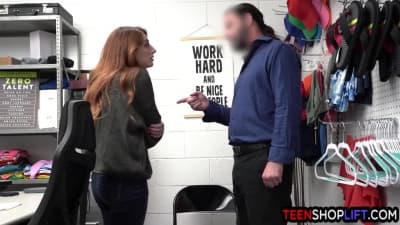 Teen redhead thief Aria Carson gets busted stealing perfume by a nasty mall cop who had different plans with her than to call the cops