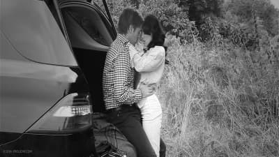 A couple, kisses in the back seat of her car and then he fucks her in various positions, under a comforter.