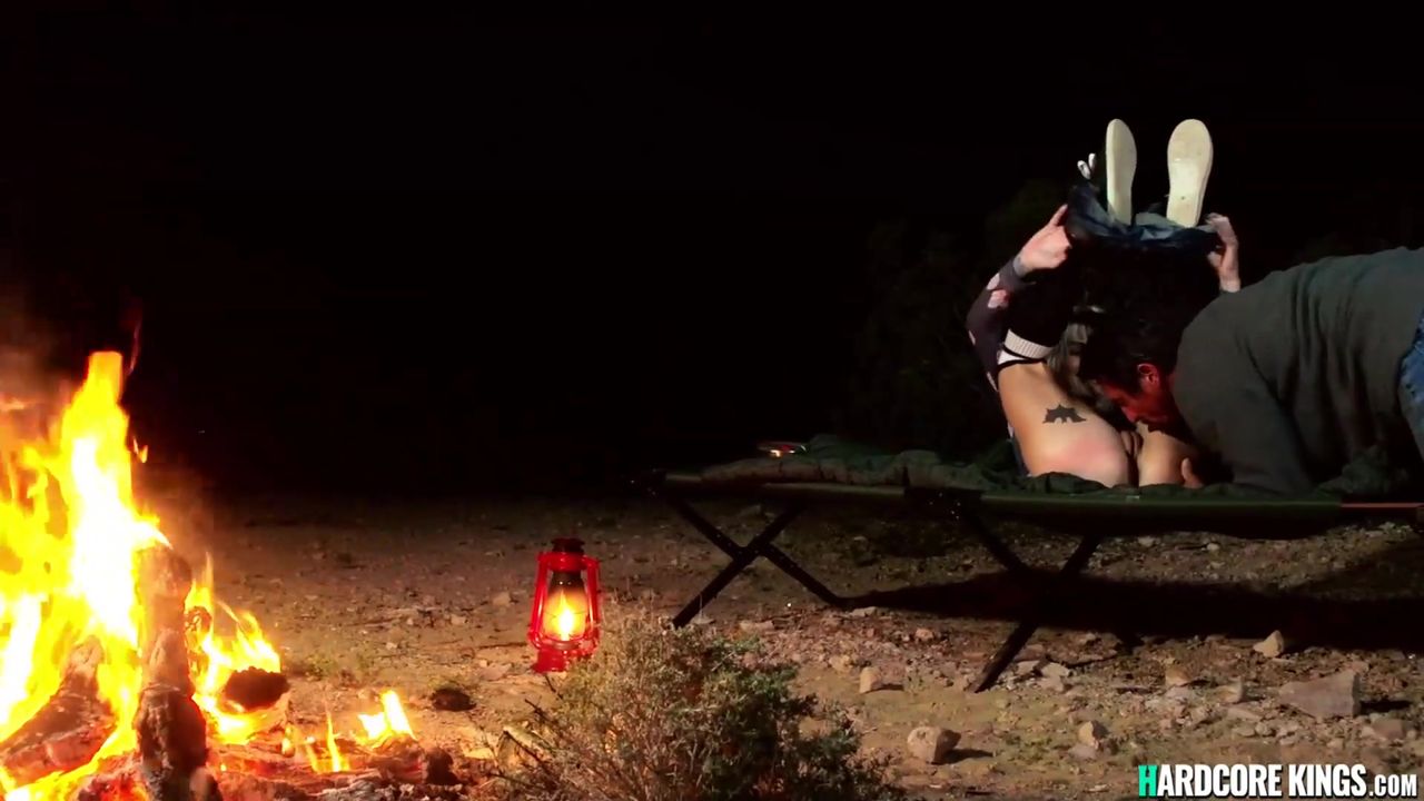 Big fake tits tattooed sexy body blonde babe Kleio Valentien and her partner Tommy Gunn fucking at night under the stars beside fire on camping
