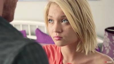 Teen blonde Dakota Skye, sucks a mature cock, fucks him missionary style and cowgirl style until he cums all over her belly.