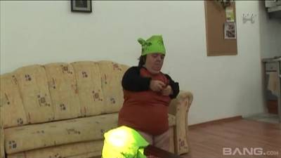 This fat midget woman is doing everything she can to satisfy this guy and she will end with jizz all over her face