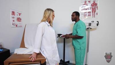 Sexy doctor Joslyn has a crush on her attractive black male nurse and she teases him until he shoves his big dick into her pussy.
