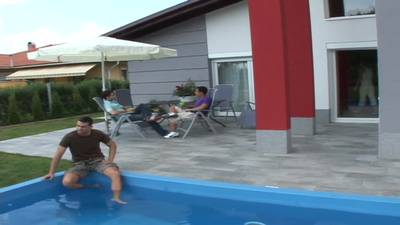Mario McGabe and Sanjoy are too horny so they start sucking dick by the pool and then they fuck each other inside.