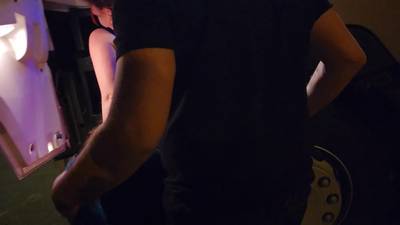We are surprised by a trucker when I open my coat wearing only my underwear so I go to him and offer him to have sex with me.