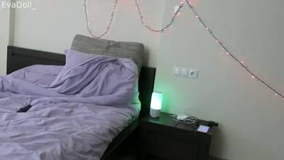 An attractive girl with large breasts, puts on black stockings, lies on the bed and masturbates with her fingers and a black dildo until she orgasms.