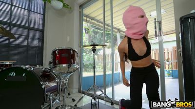 A petite brunette, arrives at a guy's house to rob him, but in the end she's going to take the guy's huge cock. She takes his dick well.