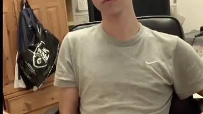 Teen gay twink, removes his grey shorts and jerks off his big erect cock non-stop until he ejaculates in his amateur video.