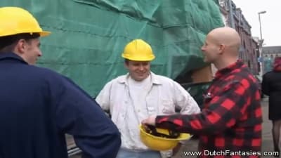 Mature curvy woman with big tits, gets fucked by three construction workers and gets cum all over her boobs.