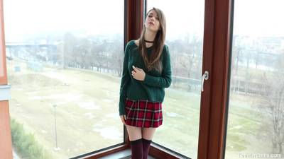 This cute teen girl, removes her clothes but keeps her socks on, to masturbates her pussy with her fingers.
