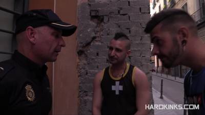 Two hunks have taken a police man aside, to humiliate him, dominate him and insult him, for messing with them. Poor thing!