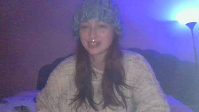 A redheaded girl in blue underwear, kneels on a bed in front of the camera and shows us how she practices sucking cock using a dildo.