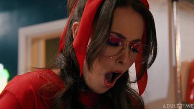 Employee doesn't have mustard sauce for the hot dog so she pulls out her fat strapon cock and jerks off into it! Then they all have fun jerking their fake cocks