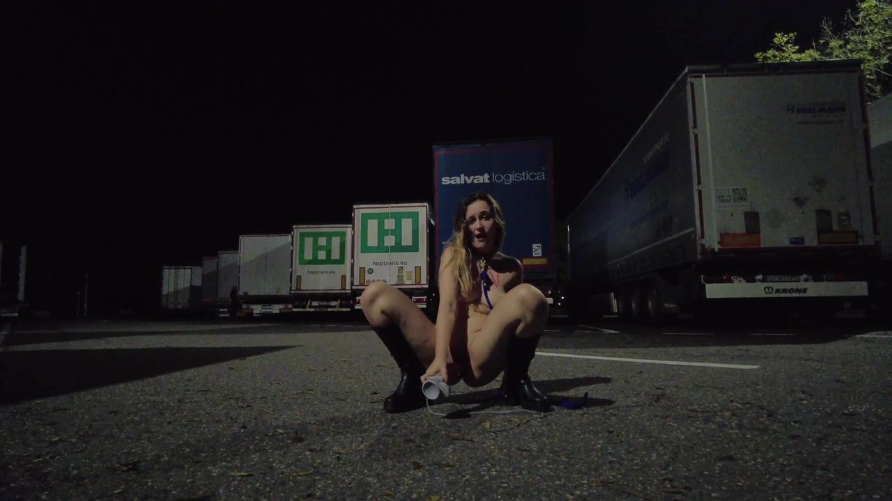 She just wants everyone to see her masturbating in the outdoor parking lot. She spreads her legs and uses her dildo to penetrate herself as she likes.