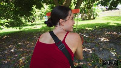 Peter is recording a vlog with his girlfriend Daisy Phoenix at a frisbee golf course but all she wants is to get on her knees and get his cock down her throat