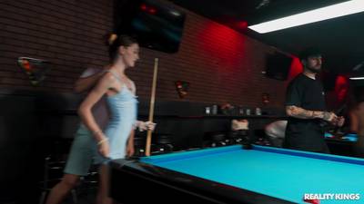 Frisky Shrooms Q flashes boobs and panties to Johnny Love at the pool hall, gets eaten out sneakily, then bends over for a hard fuck on the pool table.