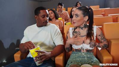 Tabatha Lust flashes her tits in a theater to Jesus Reyes, making him pull out his cock for her to suck his BBC and gets her pussy pounded loud