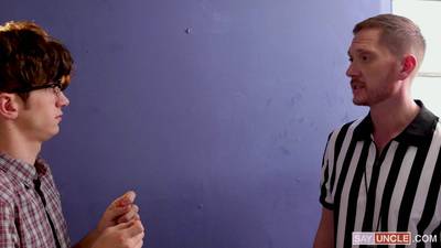 This coach doesn't let his student leave the bathroom unless he gets down on his knees to stroke his cock and suck him good
