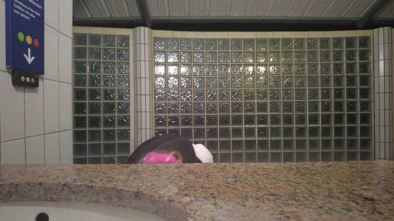 She doesn't need a special place to masturbate with her dildos; in any public toilet, she films herself inserting her sex toys.