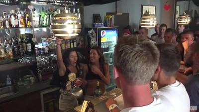 These chicks end up in the middle of a surprise gangbang in a bar full of horny guys, you can't miss this!