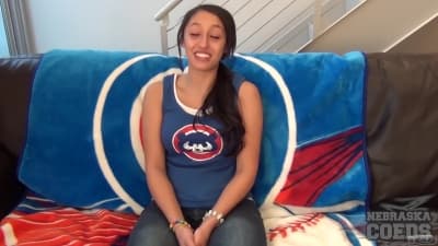 Talking and making a casting but before she need to talk about her self then show her big tits and start masturbating