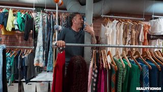 Cece is filming a vlog when she spots Scott Nails in the shop. She offers him a sneaky blowjob then fucks her pussy hard in a corner standing doggy!