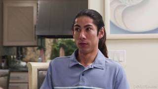New agent Raven Lane lures Chuck from her stepmom, stripping to reveal her tits, masturbating in front of him and he licks her pussy